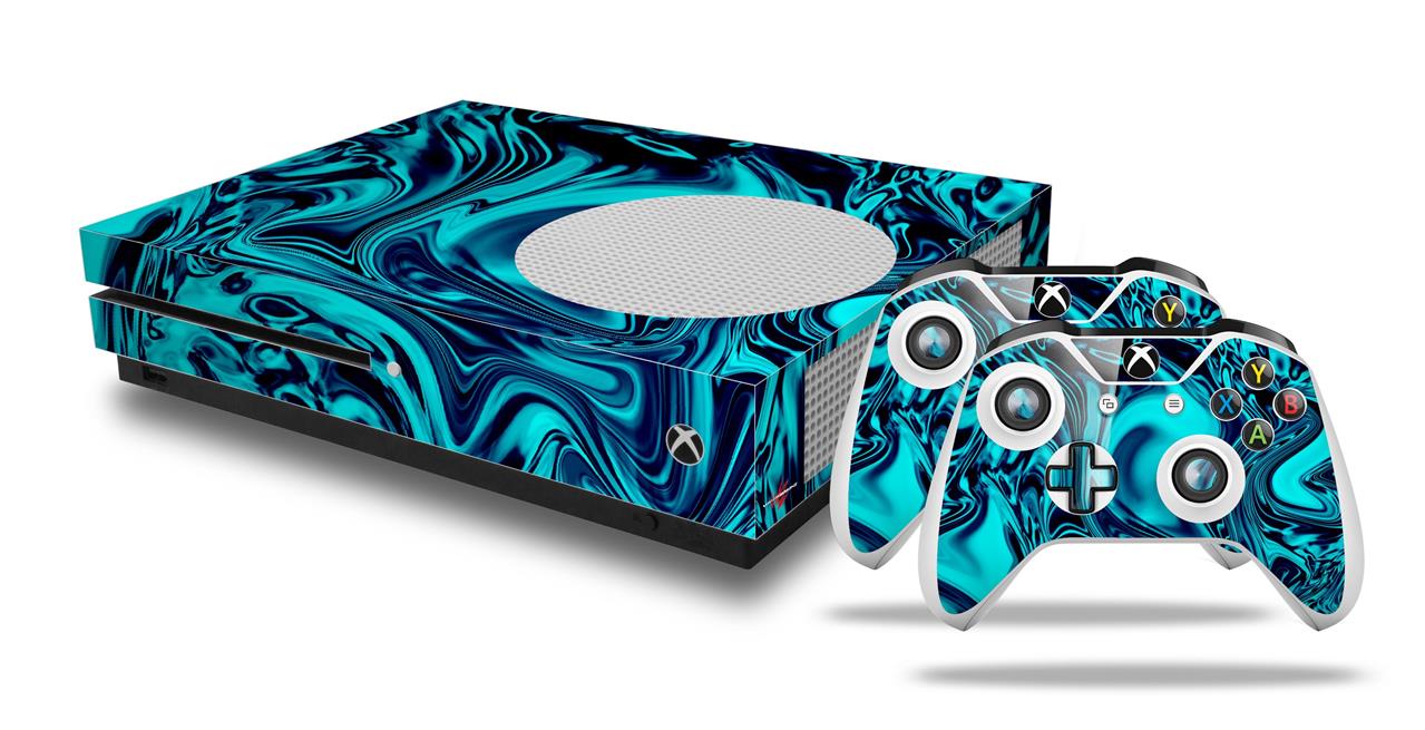 WraptorSkinz Decal Skin Wrap Set works with 2016 and newer XBOX One S Console and 2 Controllers Liquid Metal Chrome Neon Blue