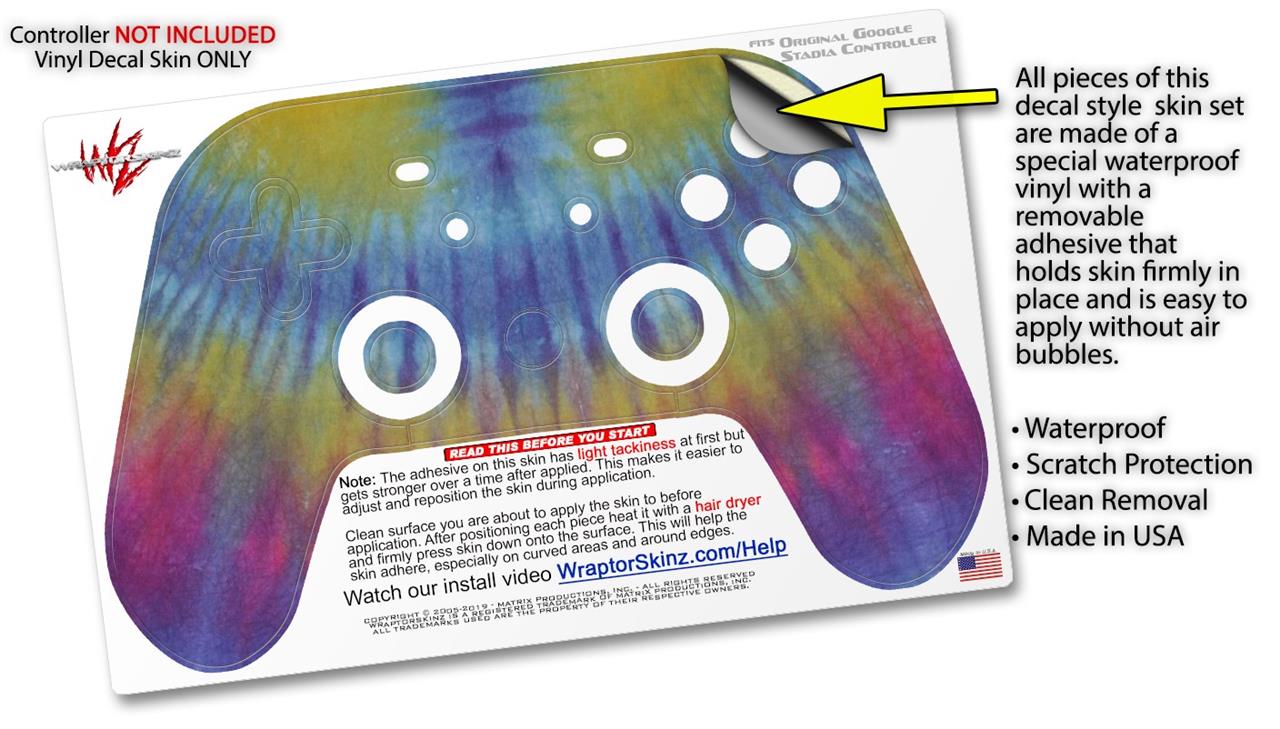 This product is in no way affiliated with or endorsed by Google. WraptorSkinz® skin wraps work with the Original Google Stadia version 1 Controller. Printed using superb photo quality designs and vibrant colors printed with special fade resistant inks that last even in direct sun for years. WraptorSkinz are a composite of two layers of commercial grade materials. The bottom layer is a soft, flexible vinyl with a special removable adhesive that is easily positioned, applied without air bubbles. Next, we print the bottom layer with UV protected, fade resistant inks that deliver superb photo quality designs in vibrant colors. Finally, we bond a professional grade laminate over the entire skin adding a glossy protective finish.