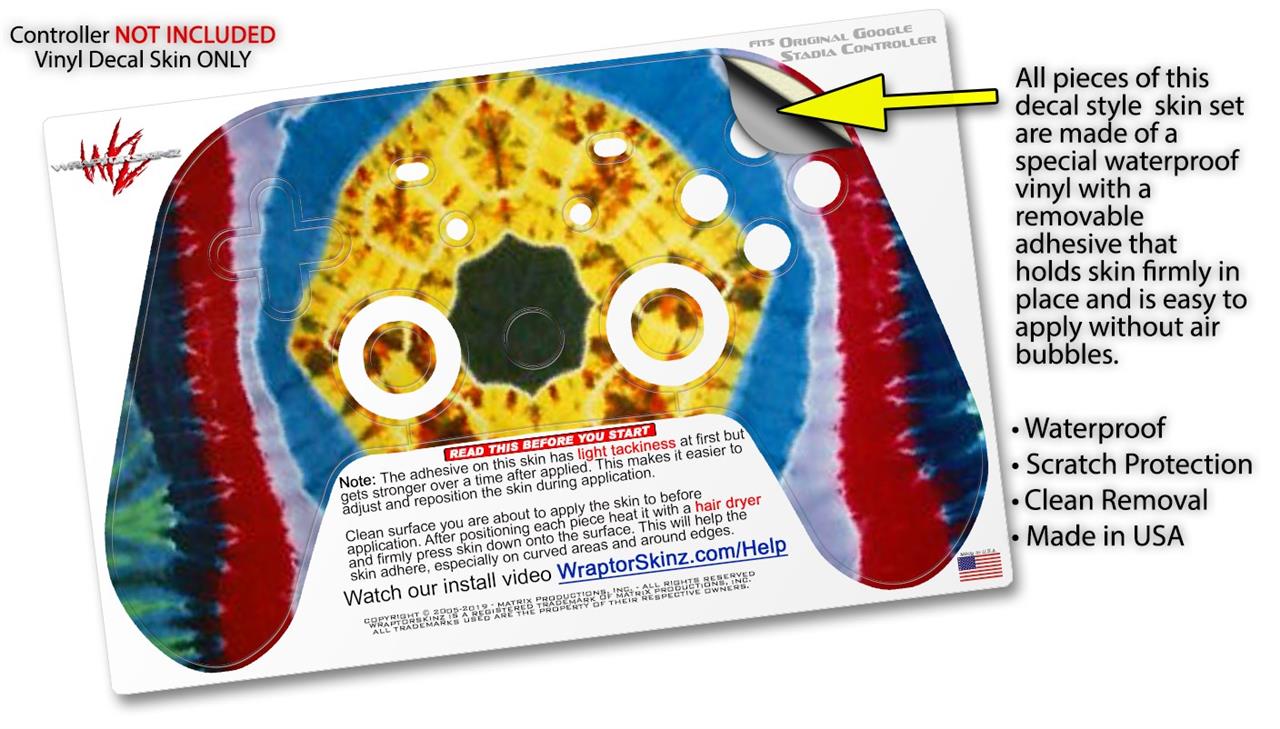This product is in no way affiliated with or endorsed by Google. WraptorSkinz® skin wraps work with the Original Google Stadia version 1 Controller. Printed using superb photo quality designs and vibrant colors printed with special fade resistant inks that last even in direct sun for years. WraptorSkinz are a composite of two layers of commercial grade materials. The bottom layer is a soft, flexible vinyl with a special removable adhesive that is easily positioned, applied without air bubbles. Next, we print the bottom layer with UV protected, fade resistant inks that deliver superb photo quality designs in vibrant colors. Finally, we bond a professional grade laminate over the entire skin adding a glossy protective finish.