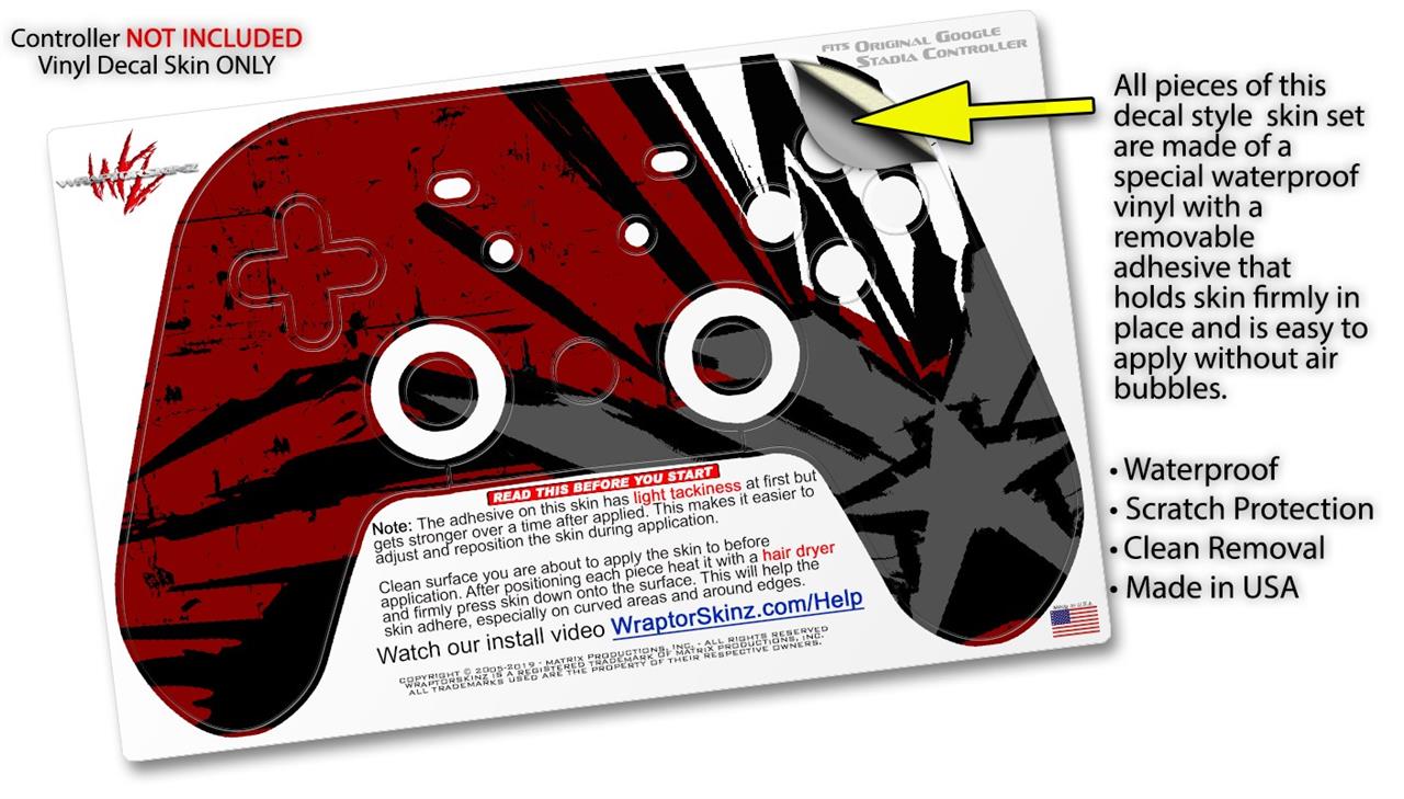 This product is in no way affiliated with or endorsed by Google. WraptorSkinz® skin wraps work with the Original Google Stadia version 1 Controller. Printed using superb photo quality designs and vibrant colors printed with special fade resistant inks that last even in direct sun for years. WraptorSkinz are a composite of two layers of commercial grade materials. The bottom layer is a soft, flexible vinyl with a special removable adhesive that is easily positioned, applied without air bubbles. Next, we print the bottom layer with UV protected, fade resistant inks that deliver superb photo quality designs in vibrant colors. Finally, we bond a professional grade laminate over the entire skin adding a glossy protective finish.