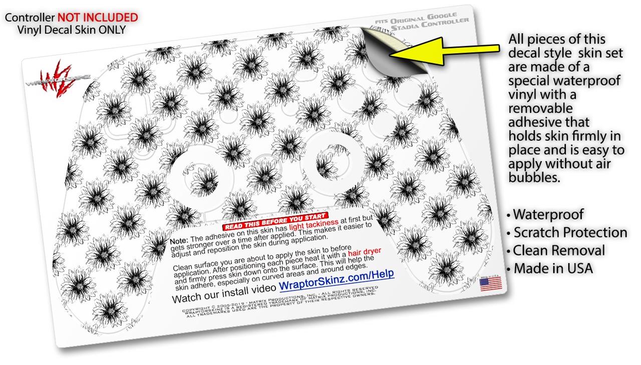 This product is in no way affiliated with or endorsed by Google. WraptorSkinz® skin wraps work with the Original Google Stadia version 1 Controller. Printed using superb photo quality designs and vibrant colors printed with special fade resistant inks that last even in direct sun for years. WraptorSkinz are a composite of two layers of commercial grade materials. The bottom layer is a soft, flexible vinyl with a special removable adhesive that is easily positioned, applied without air bubbles. Next, we print the bottom layer with UV protected, fade resistant inks that deliver superb photo quality designs in vibrant colors. Finally, we bond a professional grade laminate over the entire skin adding a glossy protective finish.