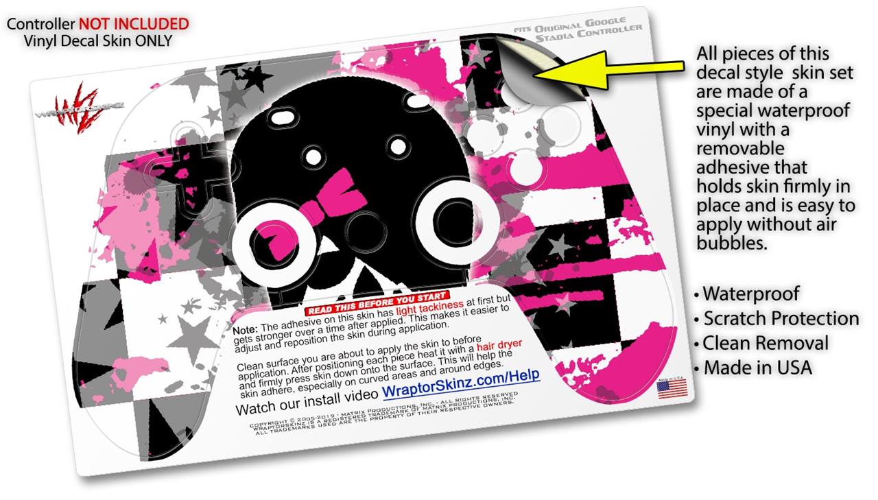 This product is in no way affiliated with or endorsed by Google. WraptorSkinz® skin wraps work with the Original Google Stadia version 1 Controller. Printed using superb photo quality designs and vibrant colors printed with special fade resistant inks that last even in direct sun for years. WraptorSkinz are a composite of two layers of commercial grade materials. The bottom layer is a soft, flexible vinyl with a special removable adhesive that is easily positioned, applied without air bubbles. Next, we print the bottom layer with UV protected, fade resistant inks that deliver superb photo quality designs in vibrant colors. Finally, we bond a professional grade laminate over the entire skin adding a glossy protective finish.