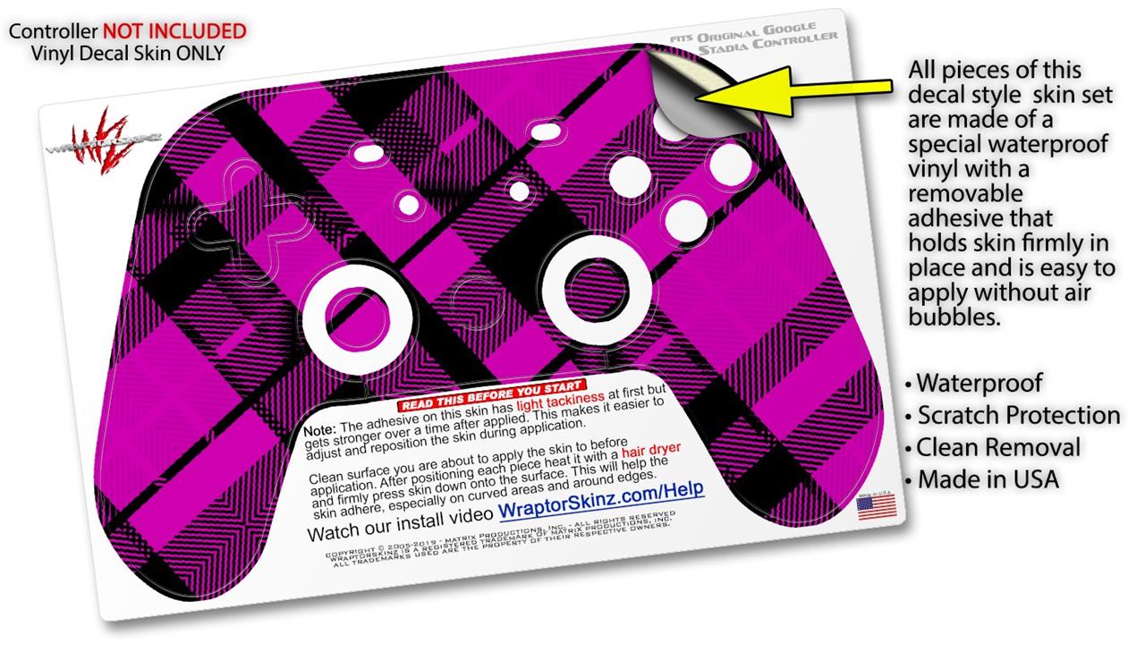 This product is in no way affiliated with or endorsed by Google. WraptorSkinz® skin wraps work with the Original Google Stadia version 1 Controller. Printed using superb photo quality designs and vibrant colors printed with special fade resistant inks that last even in direct sun for years. WraptorSkinz are a composite of two layers of commercial grade materials. The bottom layer is a soft, flexible vinyl with a special removable adhesive that is easily positioned, applied without air bubbles. Next, we print the bottom layer with UV protected, fade resistant inks that deliver superb photo quality designs in vibrant colors. Finally, we bond a professional grade laminate over the entire skin adding a glossy protective finish.