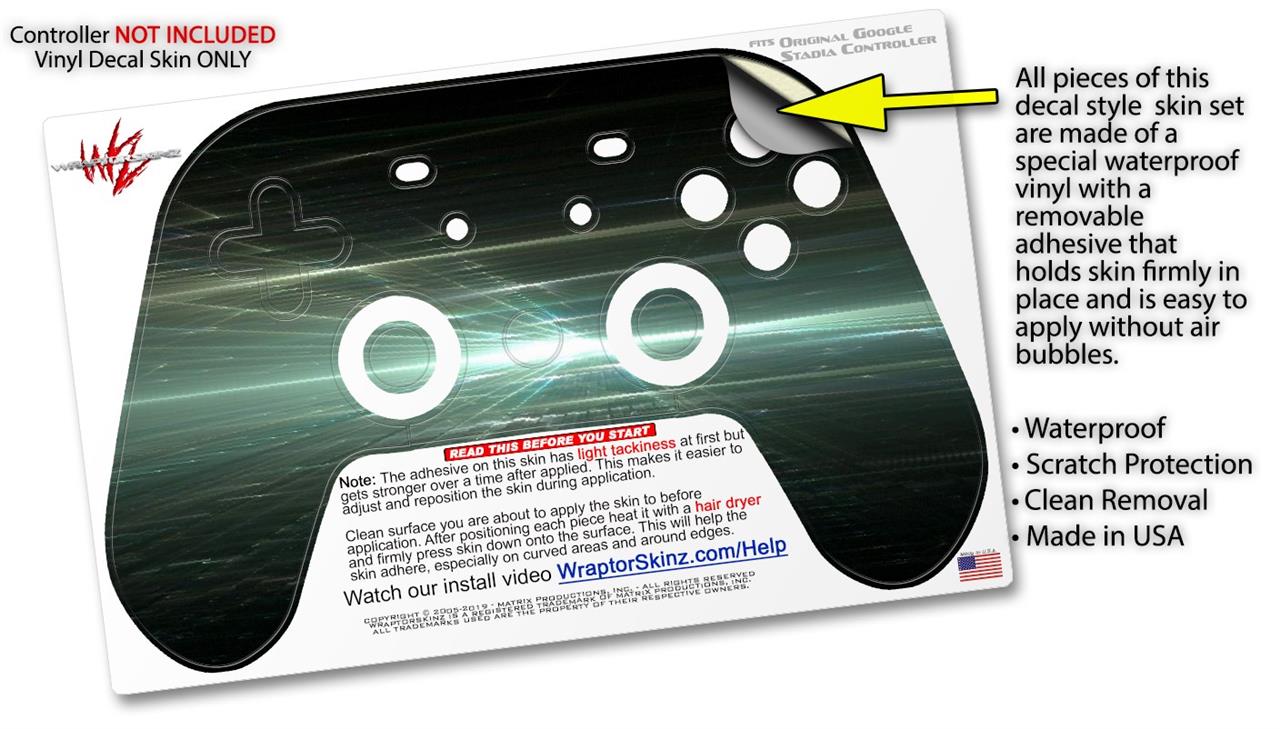 This product is in no way affiliated with or endorsed by Google. WraptorSkinz® skin wraps work with the Original Google Stadia version 1 Controller. Printed using superb photo quality designs and vibrant colors printed with special fade resistant inks that last even in direct sun for years. WraptorSkinz are a composite of two layers of commercial grade materials. The bottom layer is a soft, flexible vinyl with a special removable adhesive that is easily positioned, applied without air bubbles. Next, we print the bottom layer with UV protected, fade resistant inks that deliver superb photo quality designs in vibrant colors. Finally, we bond a professional grade laminate over the entire skin adding a glossy protective finish.