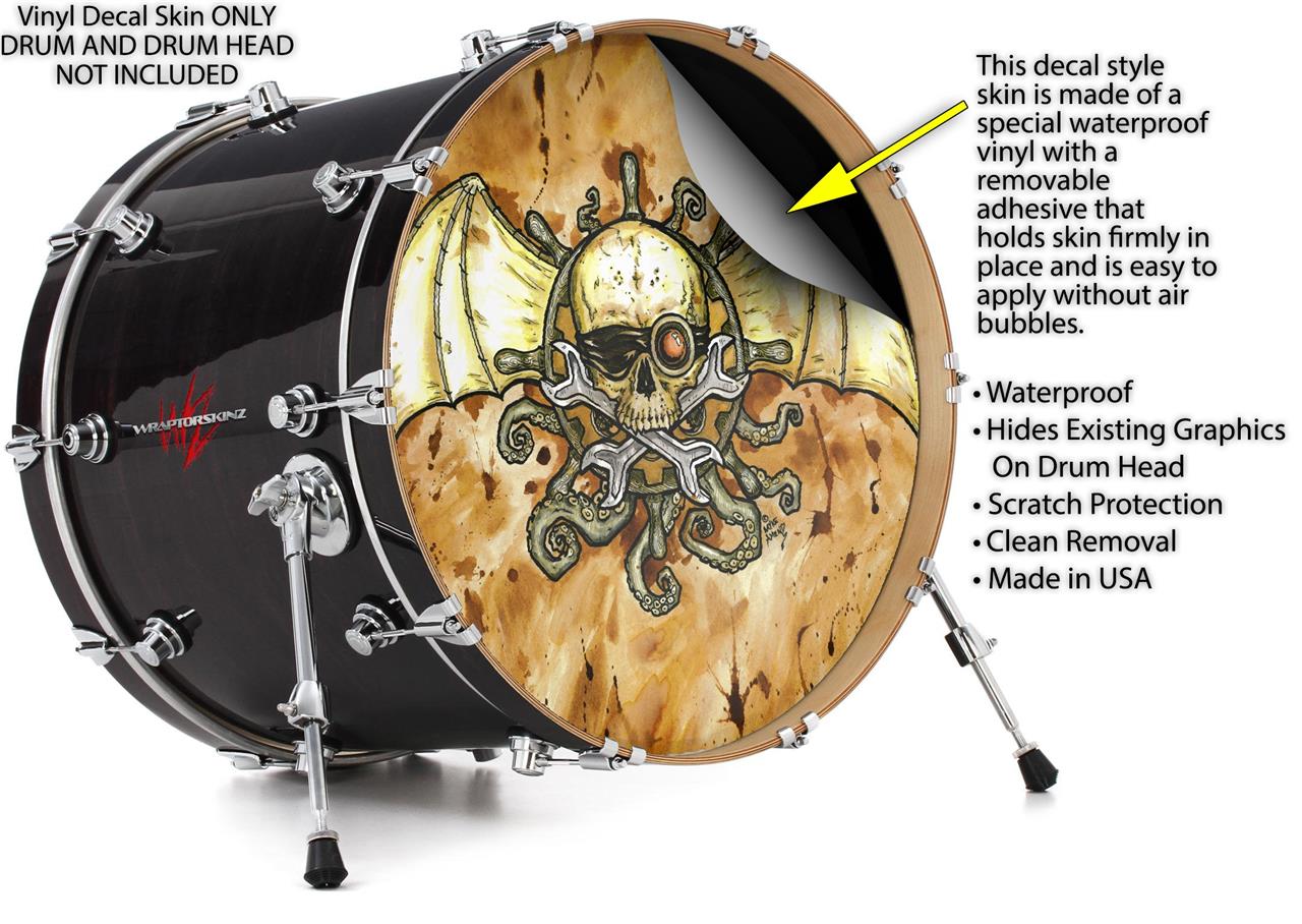 This design also available in other sizes. WraptorSkinz® skin wraps compatible with most kick drum heads. Printed using superb photo quality designs and vibrant colors printed with special fade resistant inks that last even in direct sun for years. WraptorSkinz are a composite three layer commercial grade materials vinyl. The bottom layer is a air release, grey block out removable adhesive that hides existing graphics on the drum head and is easily applied without air bubbles. The middle layer is a flexible vinyl printed with UV protected, fade resistant inks that deliver superb photo quality designs in vibrant colors. Finally, we bond a professional grade laminate over the entire skin adding a glossy protective finish.