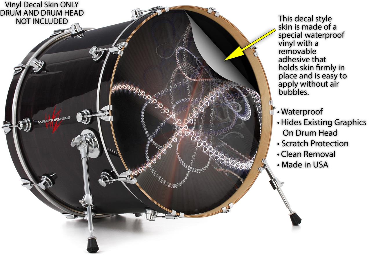 This design also available in other sizes. WraptorSkinz® skin wraps compatible with most kick drum heads. Printed using superb photo quality designs and vibrant colors printed with special fade resistant inks that last even in direct sun for years. WraptorSkinz are a composite three layer commercial grade materials vinyl. The bottom layer is a air release, grey block out removable adhesive that hides existing graphics on the drum head and is easily applied without air bubbles. The middle layer is a flexible vinyl printed with UV protected, fade resistant inks that deliver superb photo quality designs in vibrant colors. Finally, we bond a professional grade laminate over the entire skin adding a glossy protective finish.