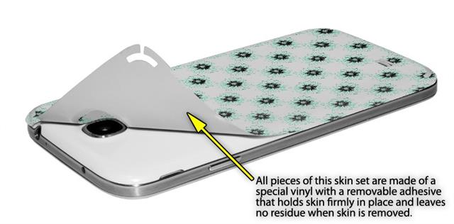 • Decal style vinyl skin covers front and back of Samsung Galaxy S4 phone.