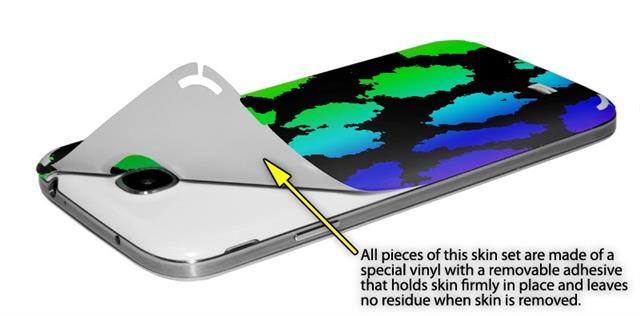 • Decal style vinyl skin covers front and back of Samsung Galaxy S4 phone.