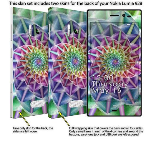 • Decal style vinyl skin covers front, back and side of Nokia Lumia 928 phone.