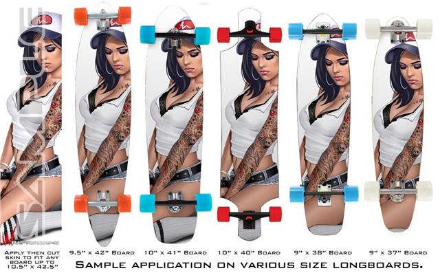 Our longboard skins are made so that one size fits boards up to 10” wide x 42” long. This means after applying the skin it you will trimming to fit you’re the shape of your board with a sharp utility knife.